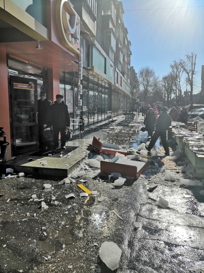 Упавшие с крыш глыбы разрушили вывески.