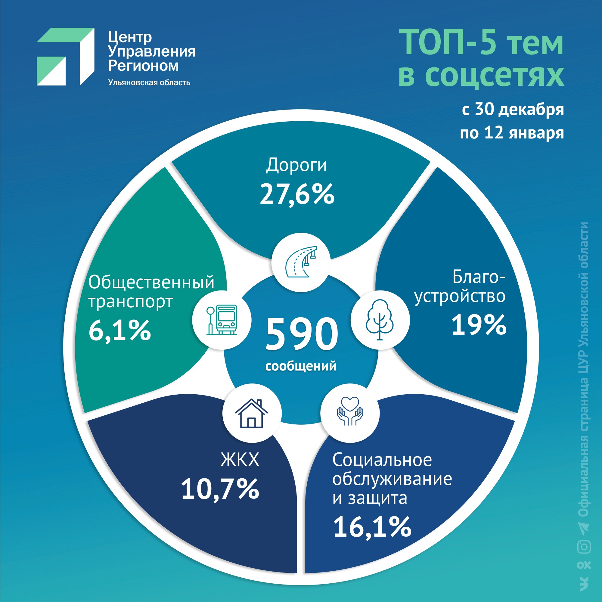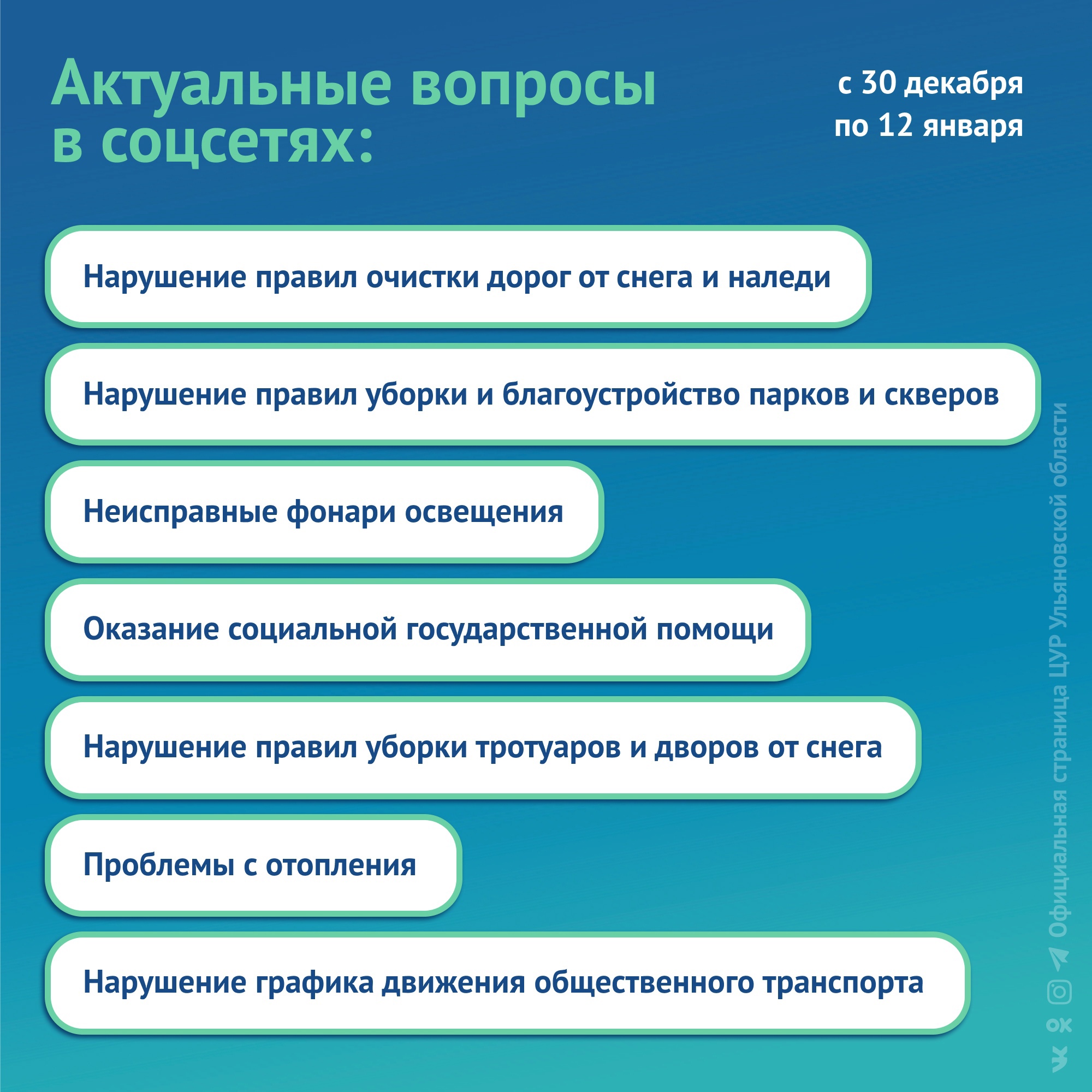 ЦУР Ульяновской области опубликовал топ-5 обращений жителей в соцсетях с 30 декабря по 12 января.