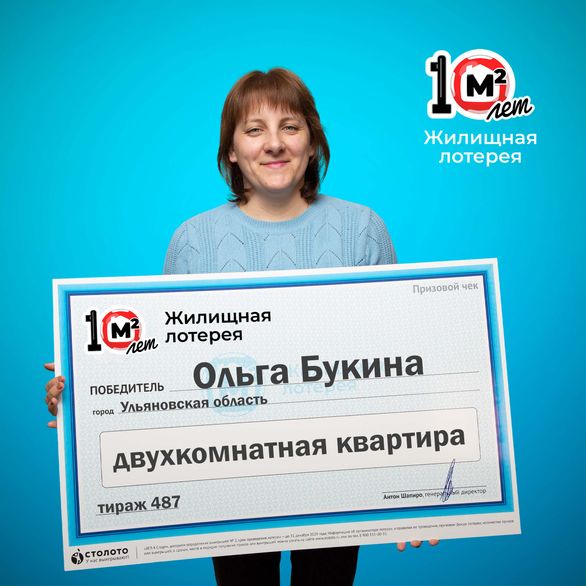 Ольга Букина из Ульяновской области работает в медицинском техникуме. В свободный час она зашла на «Почту России» отправить корреспонденцию и заодно купила билет государственной «Жилищной лотереи». Не глядя, вытянула один из середины пачки. Прошло пару дней, и во время трансляции 487-го тиража она узнала, что выиграла двухкомнатную квартиру стоимостью 4 млн рублей.