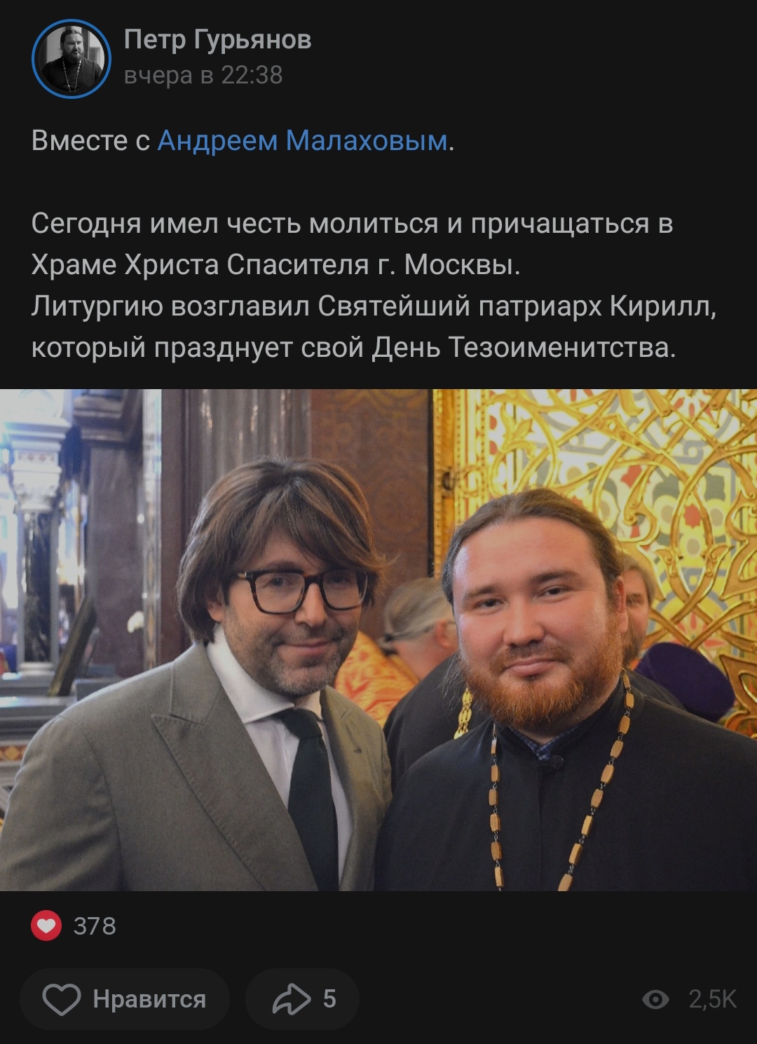 Литургию возглавил Святейший патриарх Кирилл, который празднует свой День Тезоименитства. При этом также присутствовал известный тележурналист и шоумен Андрей Малахов.