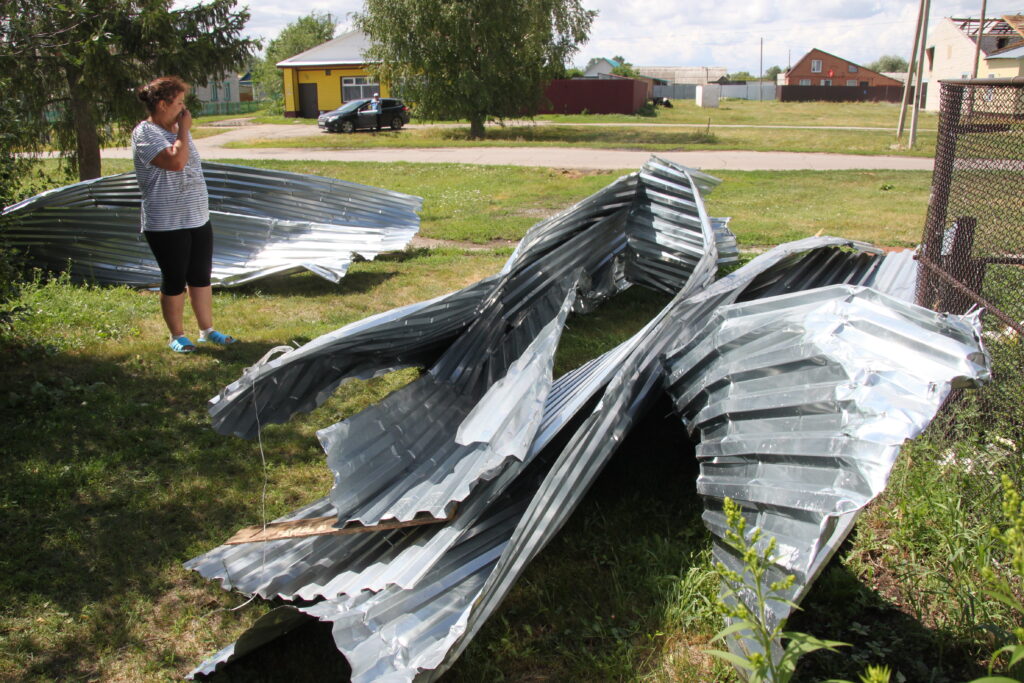 На улице Советской на обочине лежали разбросанные куски шифера, поломанные доски и металлические листы. Двое сельчан, забравшись на сарай, забивали гвозди.