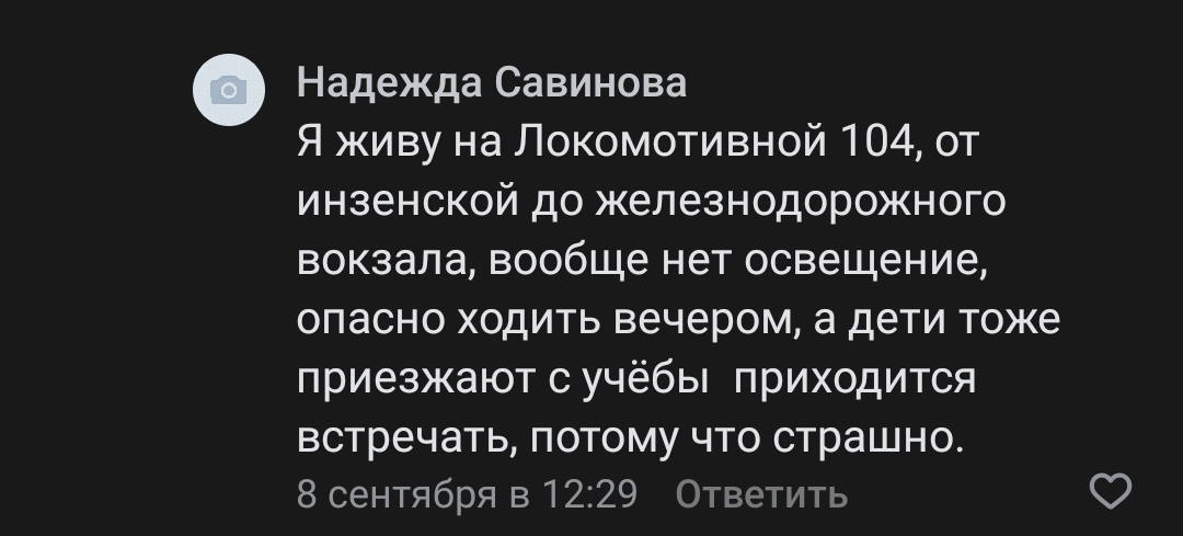 Подтверждает слова предыдущего комментатора ещё один житель Железнодорожного района. Он утверждает, что в Киндяковке освещения практически нет, людям приходится добираться домой в полной темноте.