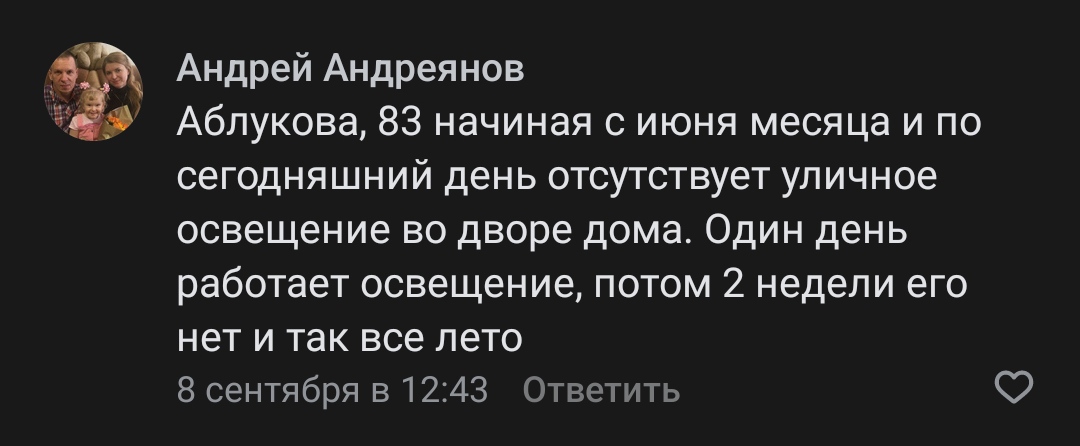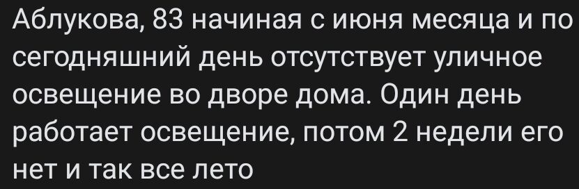 Аналогичная ситуация складывается на улице Аблукова, около 83-го дома. Как сообщает мужчина, во дворе с июня отсутствует освещение, которое включают раз в две недели.