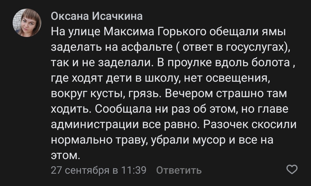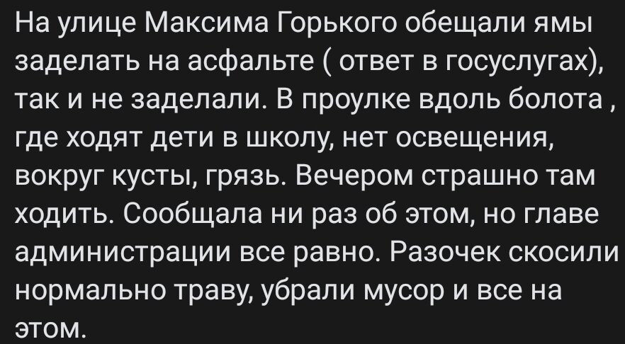 Другая местная жительница рассказывает о проблемах на улице Максима Горького в Засвияжье. Помимо сплошной грязи по пути детей в школу на улице нет освещения. Женщина уточняет, что неоднократно сообщала об этом, но должной реакции местной власти не последовало.