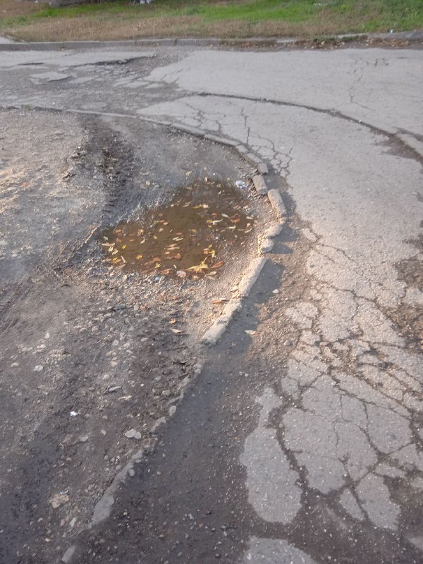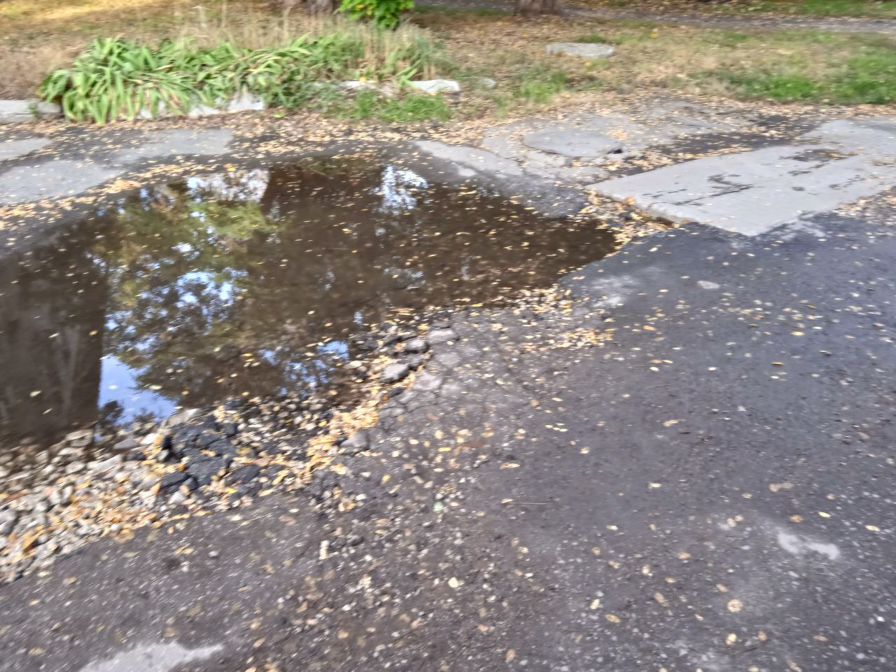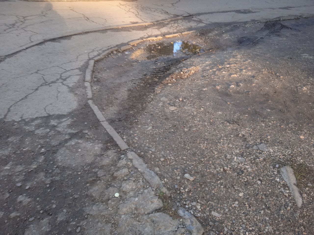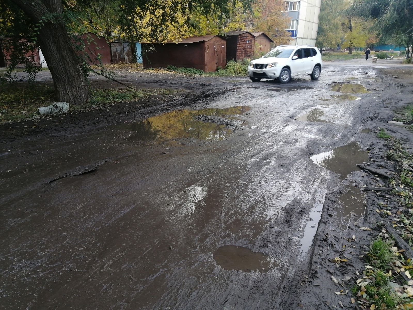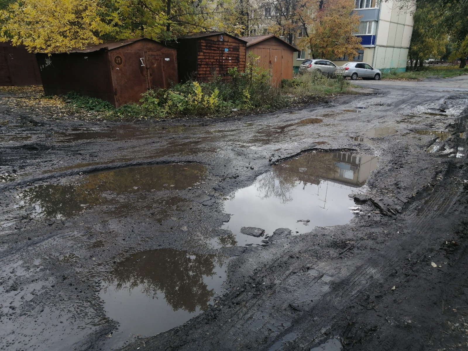 Убитый асфальт есть и в других уголках Ленинского района. Как видно на фотографии, на дороге около гаражей образовались большие, судя по всему, вечные лужи, которым скоро можно будет дать топографические называния.
