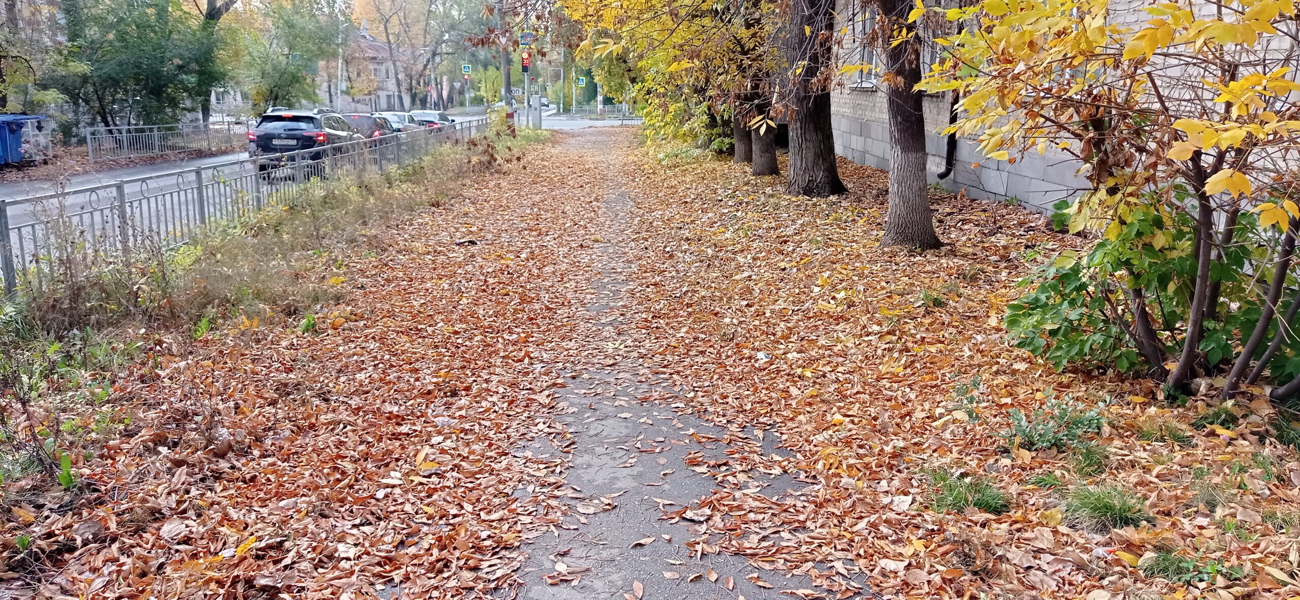 Если выходить на проспект Нариманова с Симбирской улицы, рядом со зданием, где сидит один из депутатов гордумы, можно увидеть неубранный от листвы тротуар.