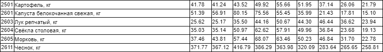 Для наглядности, чтобы разность цен была очевиднее, сложим стоимость овощей, чтобы получить среднюю цену «борщевого набора» (без чеснока).