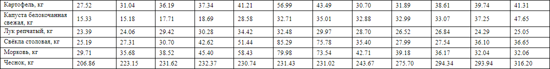 Так, в январе картофель стоил 41 рубль (копейки опускаем), капуста 51 рубль, а уже в сентябре цены упали до 21 и 15 рублей соответственно. Лук репчатый в январе стоил 25 рублей, чуть дешевле в сентябре – 23 рубля. Январские цены на свёклу в среднем составили 35 рублей, сентябрьские – 19 рублей. Морковь продавалась за 37 рублей в январе, и в сентябре – за 22 рубля. Килограмм чеснока зимой стоил 371 рубль, в начале осени 258 рублей.