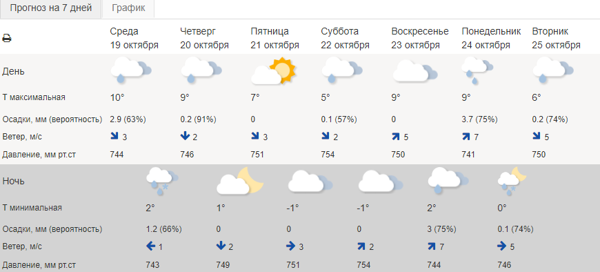 В Москве 19 октября ожидаются небольшие дожди, ветер умеренный, днем около +10 градусов, то есть примерно также как и во вторник. Уже в четверг начнется похолодание, пока лишь слегка будет подмораживать по ночам до -2 градусов, и дневная температура понизится до +5…+7 градусов. Но осадки начнут прекращаться. И в конце недели мы снова может увидеть солнце, хотя и при более прохладной погоде, ночью около 0, днем не выше +10 градусов.