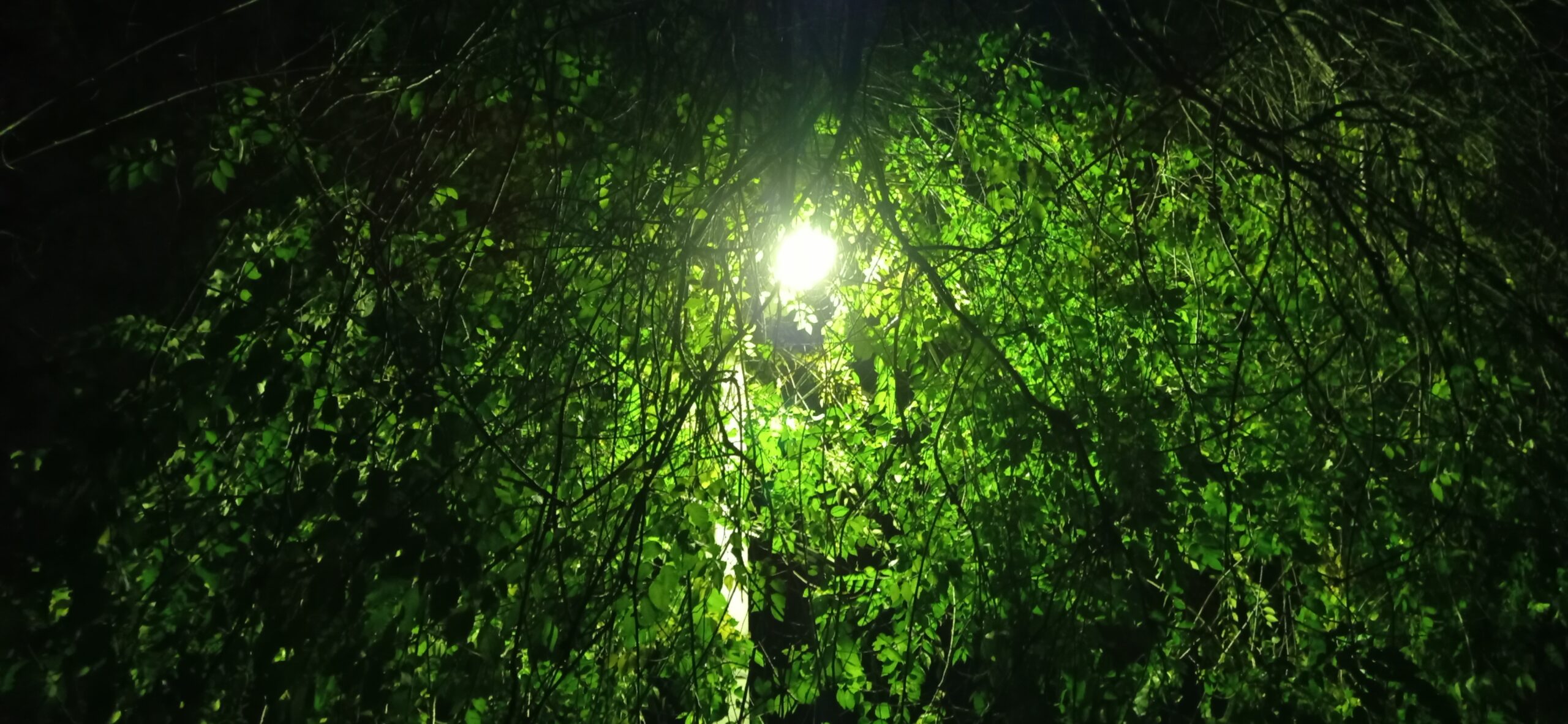 Есть и забавные ситуации. Там, где, казалось бы, горит фонарь, всё-равно темно. Дело в том, что во дворе между ФОК «Фаворит» и Краснопролетарской улицей лампа «утонула» в сучках и листьях сломанной ветки.