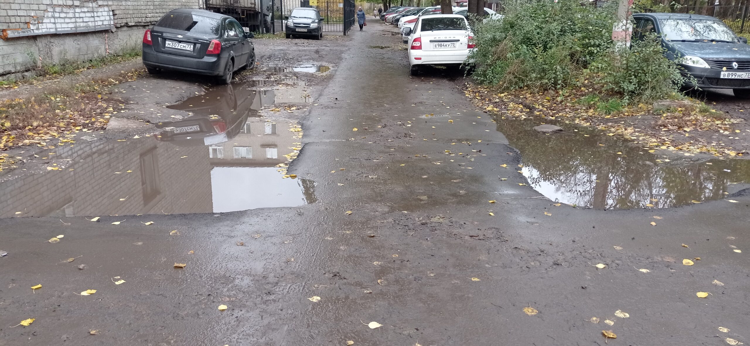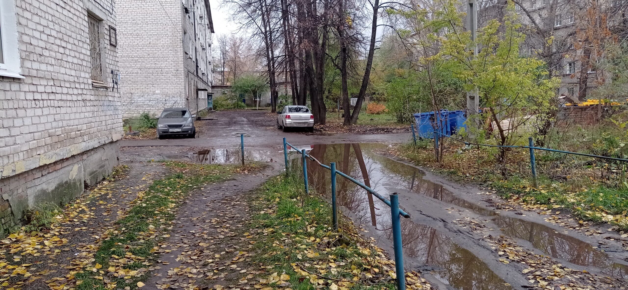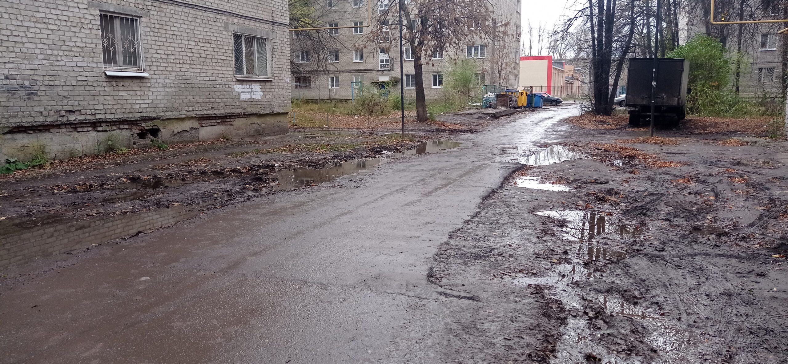 Следующая улица, которую нам довелось «проинспектировать», находится в Заволжском районе. Злополучная улица 9 мая, получившая название в честь Великой победы, представляет собой печальное зрелище. Помимо того, что фасады находятся в полуразрушенном состоянии, а крыши ждут зимы, чтобы обрасти метровыми сосульками, дворы утонули в грзяи.