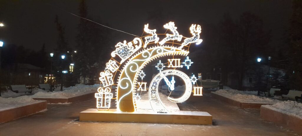Cпециалисты МБУ «Горсвет» подключили к электричеству световые фигуры «Маска» на Театральной площади и «Часы» в сквере Гончарова.