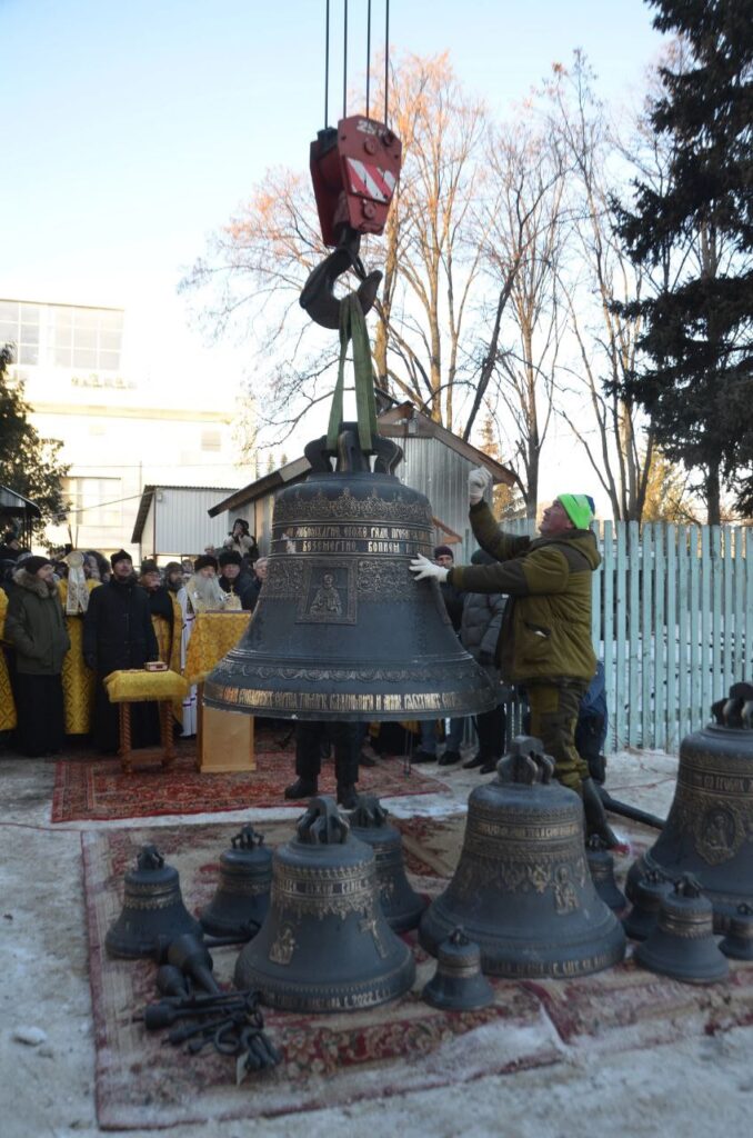 6 декабря в строящемся храме во имя святого благоверного великого князя Александра Невского митрополит Симбирский и Новоспасский Лонгин совершил Божественную литургию, после которой на звонницу храма начался подъём колоколов.