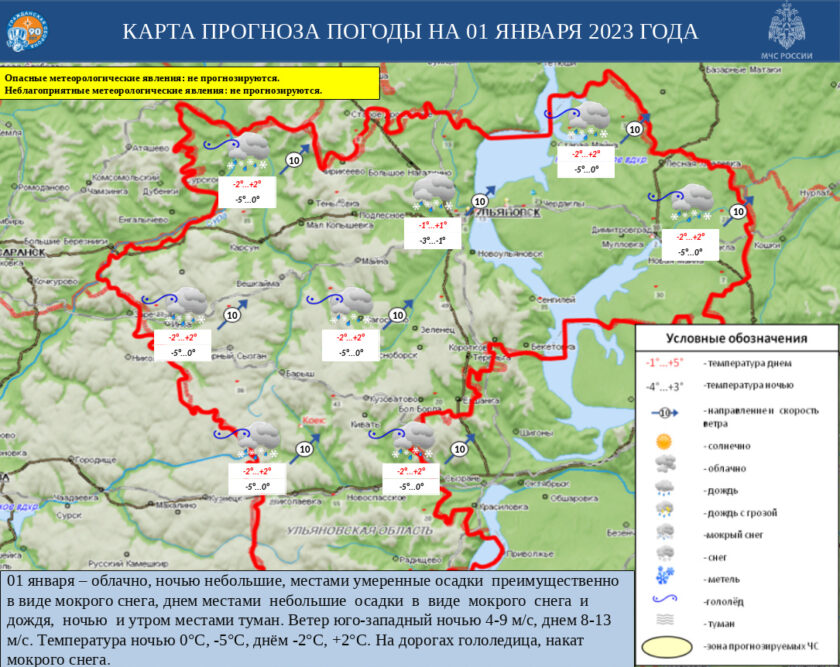 1 января в Ульяновской области облачно, ночью небольшие, местами умеренные осадки преимущественно в виде мокрого снега, днем местами небольшие осадки в виде мокрого снега и дождя, ночью и утром местами туман. Ветер юго-западный ночью 4-9 м/с, днем 8-13 м/с. Температура ночью 0°С, -5°С, днём -2°С, +2°С.