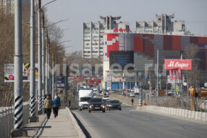 Пешеходный переход в этом месте не предусмотрен. Он сделан только через одну полосу движения. Попасть на другую сторону никак не получится. Также обстоят дела и с остановкой у торгового центра. Она есть только, с одной стороны.