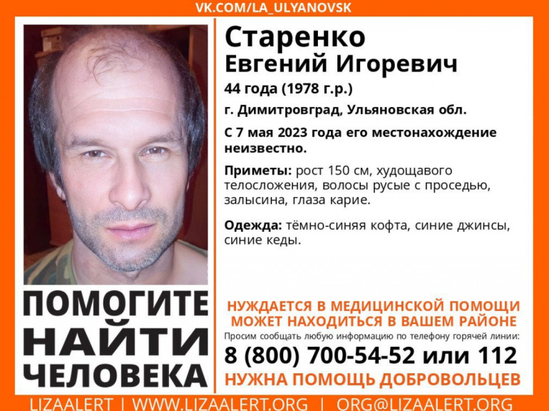 Волонтеры из поисково-спасательного отряда «Лиза Алерт» в своей официальной группе сообщают о пропаже 44-летнего жителя Димитровграда.