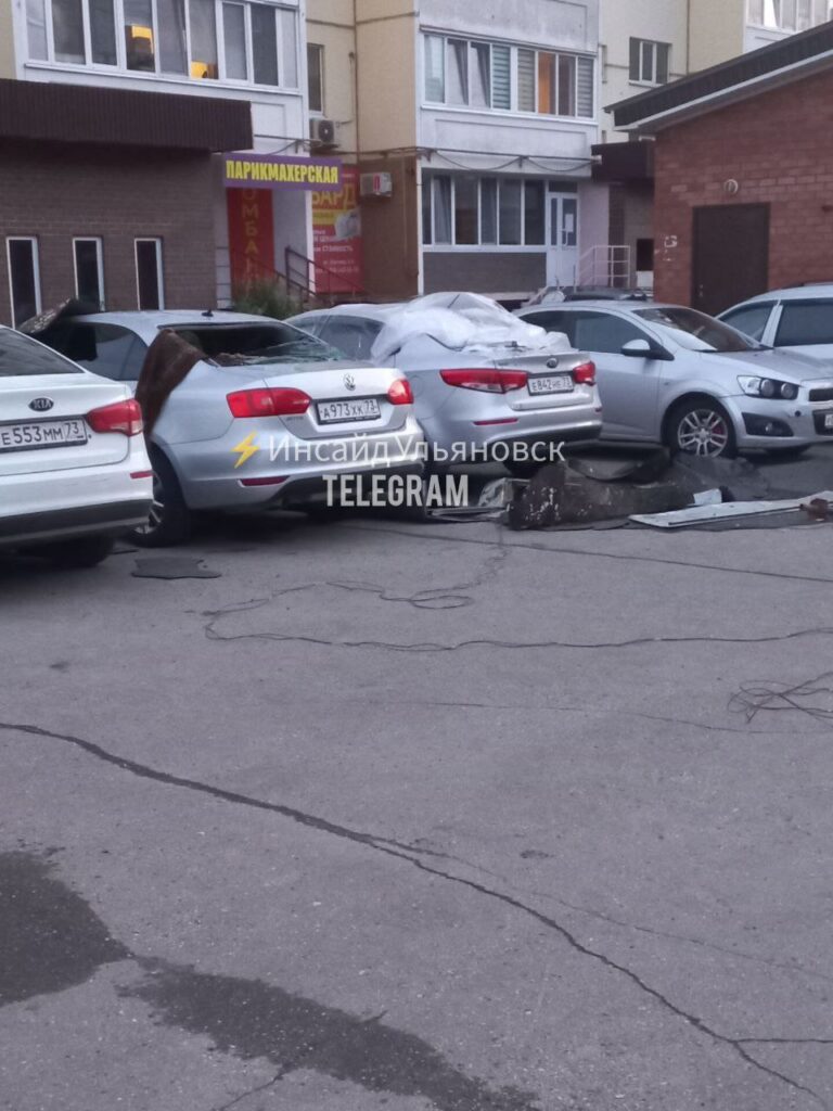 Сегодня в социальных сетях местные жители улицы Шигаева делятся фотографиями. На снимках видно, как часть дома упала на машины после урагана.