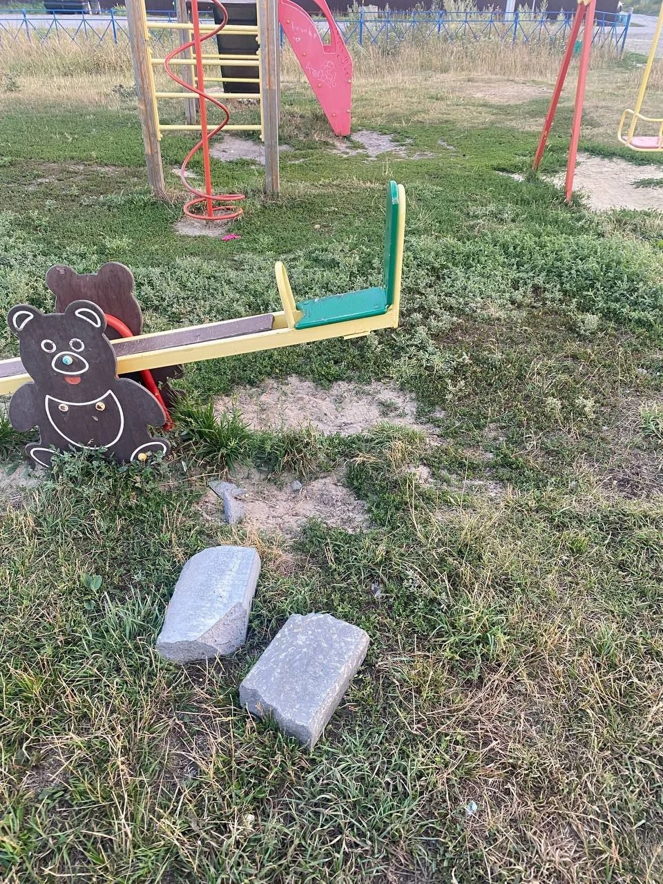 На фотографии очевидца явно видно, что баскетбольная площадка, а точнее два кольца, установлены впритык к велосипедной дорожке. На детской же площадке бесхозно разбросаны обломки бордюра.