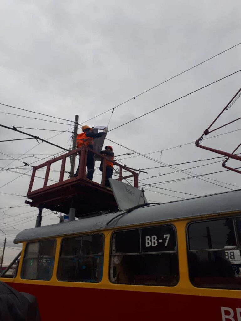 Напомним, что сегодня, 17 октября, из-за непогоды оторвался баннер и запутался в контактной сети на проспекте Гая в Железнодорожном районе. Движение трамваев временно было закрыто.