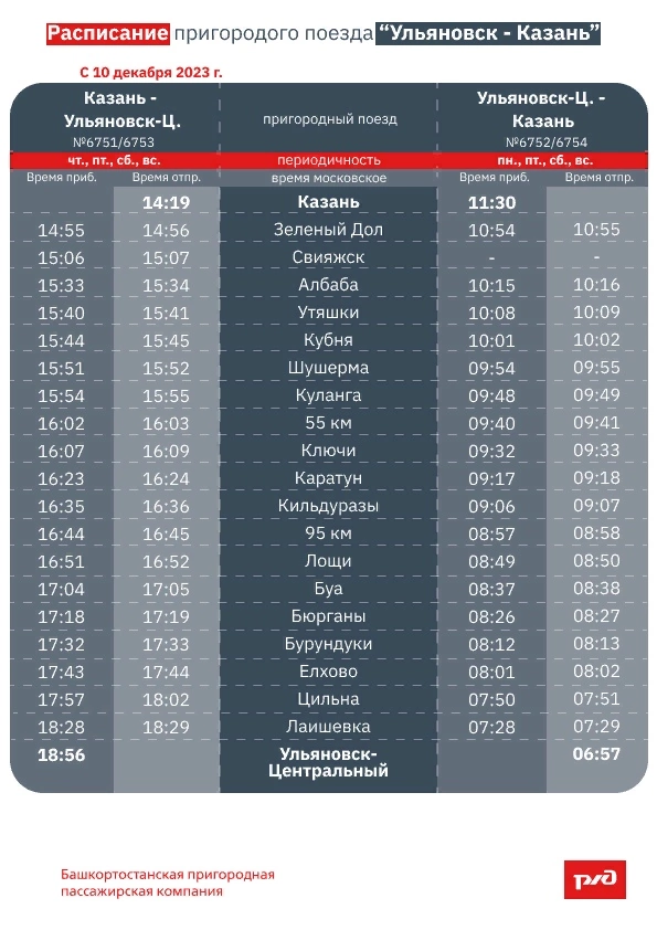С сегодняшнего дня (10.12.2023) изменилось расписание пригородных поездов в Ульяновской области, что было сообщено на сайте Башкортостанской пригородной пассажирской компании.