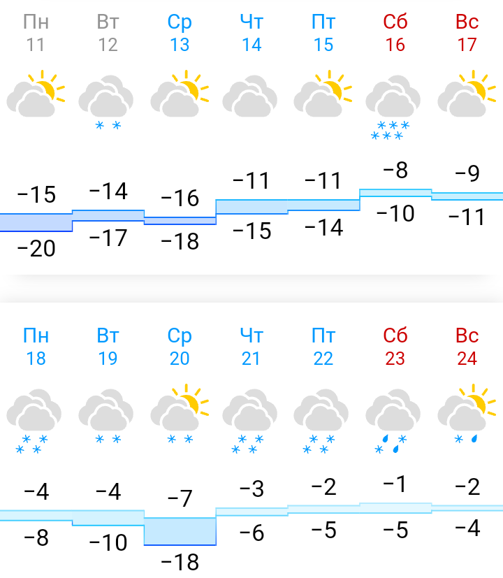 Спешим вас обрадовать. По прогнозам метеорологов в ближайшие дни морозы отступят. Уже к выходным, днём температура воздуха не будет падать ниже -10 градусов. Ночью обещают до -11.