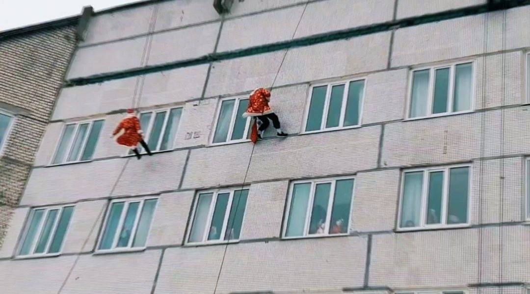 К юным пациентам детской больницы с крыши спустились Деды Морозы