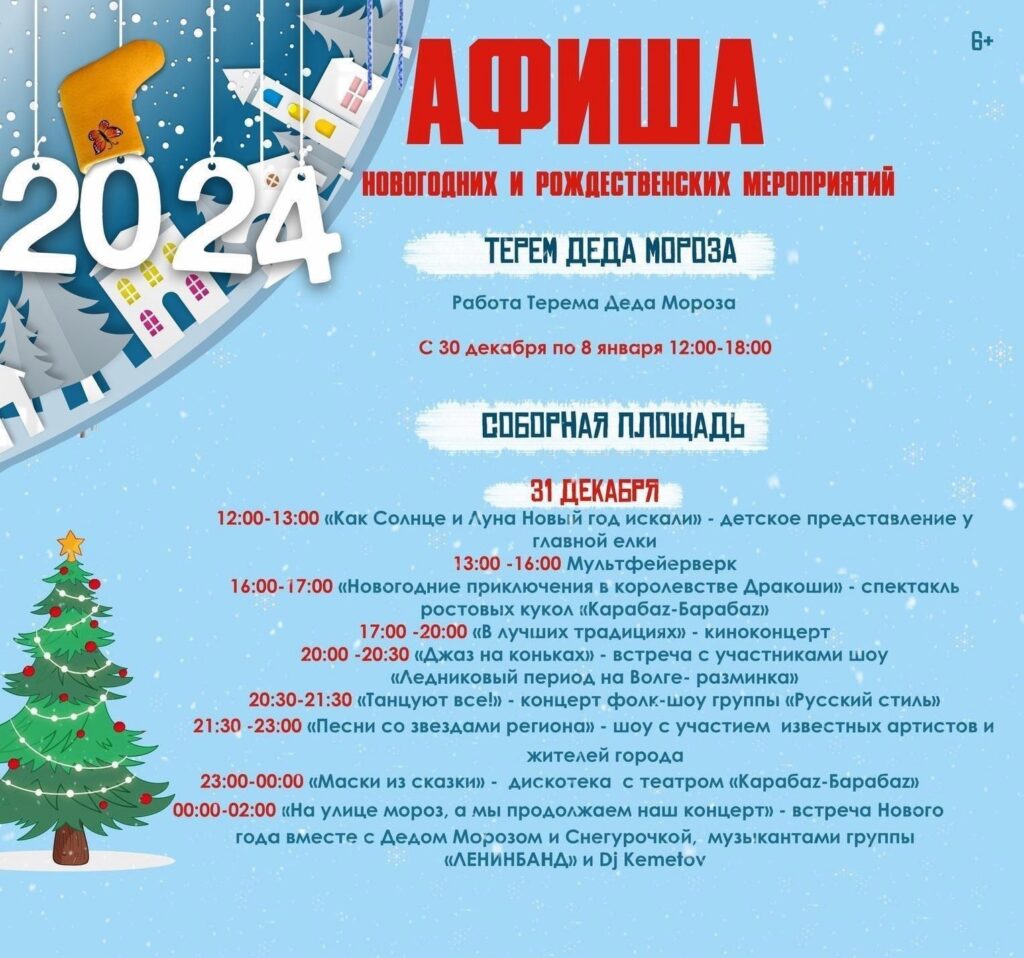 Встреча нового 2024 года пройдёт с участием Деда Мороза, Снегурочки, музыкантами группы «ЛЕНИНБАНД» и Dj Kemetov. Новогодняя программа продолжится до двух часов ночи.
