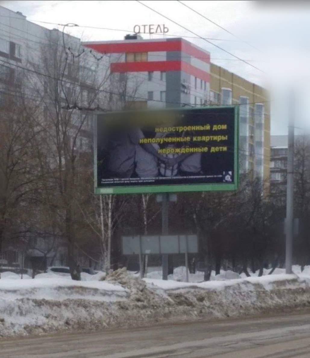 В сети появился пост, где обманутые дольщики из Ульяновска опубликовали фото баннера с надписью: «недостроенный дом, неполученные квартиры, нерождённые дети».