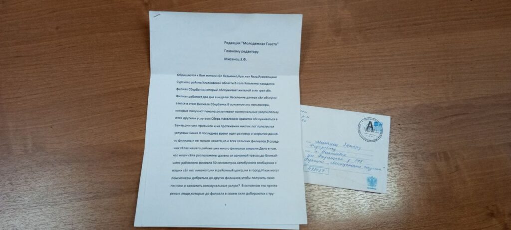 В пятницу, 17 января, на страницах “Молодежной газеты” было опубликовано письмо жителей Сурского района. В нём жители трёх сел пожаловались на то, что в селе Кезьмино закрывают отделение Сбербанка.
