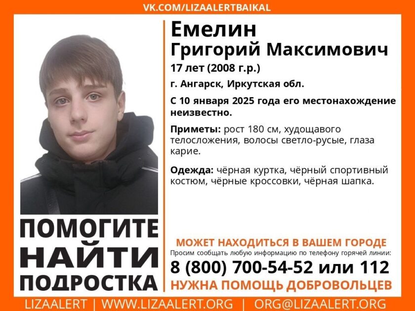 В городе Ангарск (Иркутской области) пропал 17-летний подросток. С 10 января 2025 года его местонахождение неизвестно. Есть предположения, что несовершеннолетний может находиться на территории Ульяновской области. Волонтеры просят откликнуться всех, кто видел юношу.