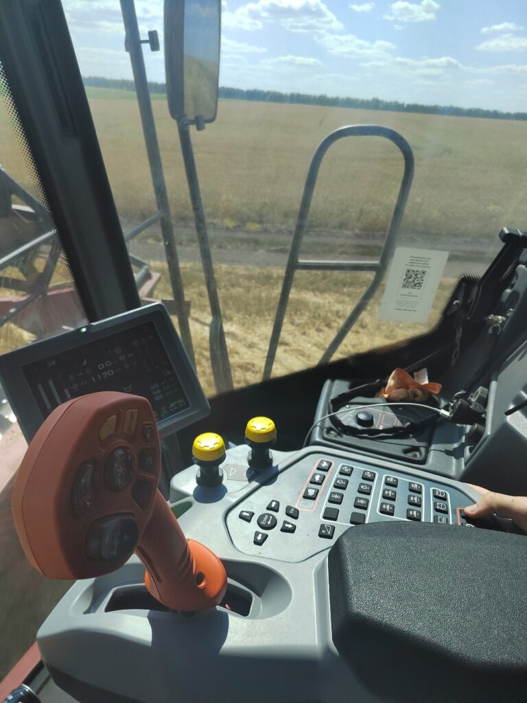 У Степана новый российский комбайн, внутри есть сжатый воздух для очистки салона и себя от пыли, кондиционер и небольшой холодильник. Руль, джойстик, сенсорный экран управления, кнопки наверху по периметру кабины создают ощущение, что находишься не в комбайне, а в кабине пилота самолёта. Для пассажира есть удобная сидушка. Молодой комбайнёр прекрасно чувствует свою технику.