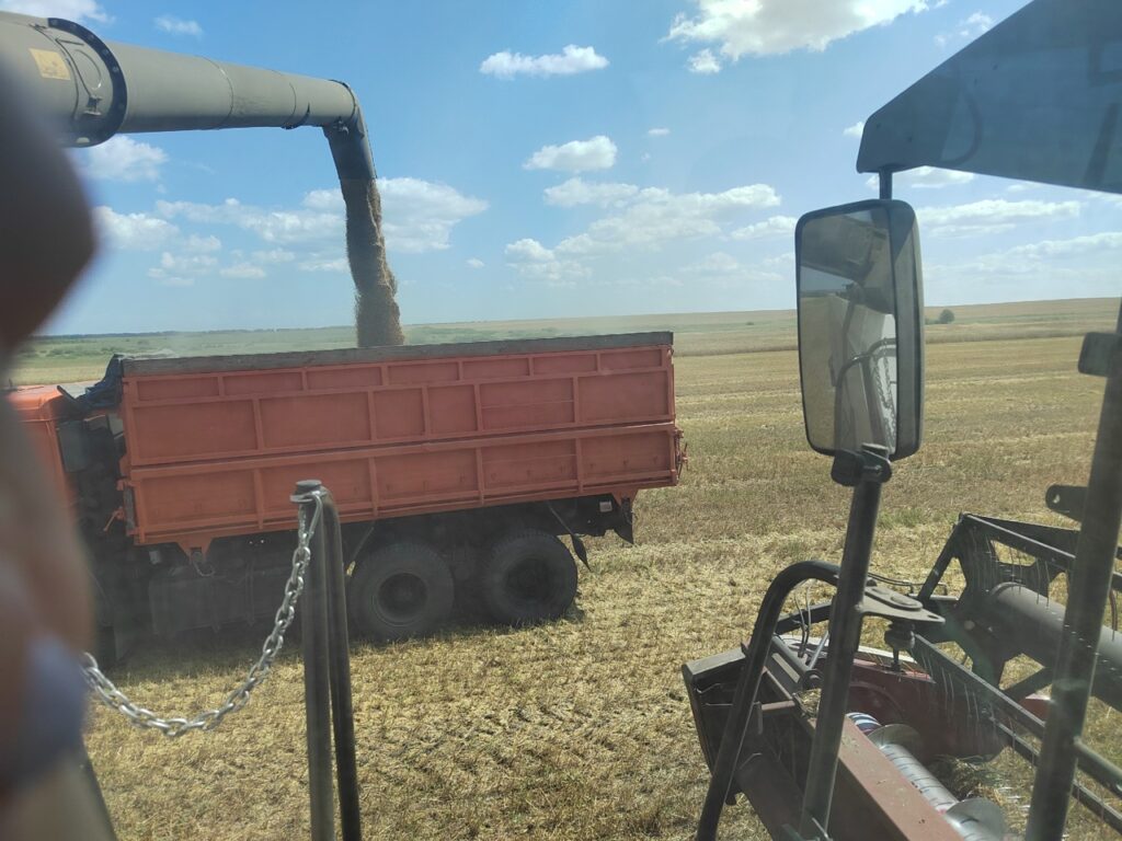 Через каждые 15 минут подъезжал грузовик, и мы выгружали зерно. Несмотря на то, что комбайн новый, вибрация для нас была непривычной. Когда работает выгрузка – трясёт вдоль, а когда едешь и работает жатка – поперёк. Вдалеке показалась «буханка» с обедом. В меню были щи да каша с котлетой и компот. Мы угостились компотом, хотя нас готовы были накормить. Кроме того, работников на полях кормят ещё и ужином в шесть часов. После девяти работать смысла уже нет, темнеет.