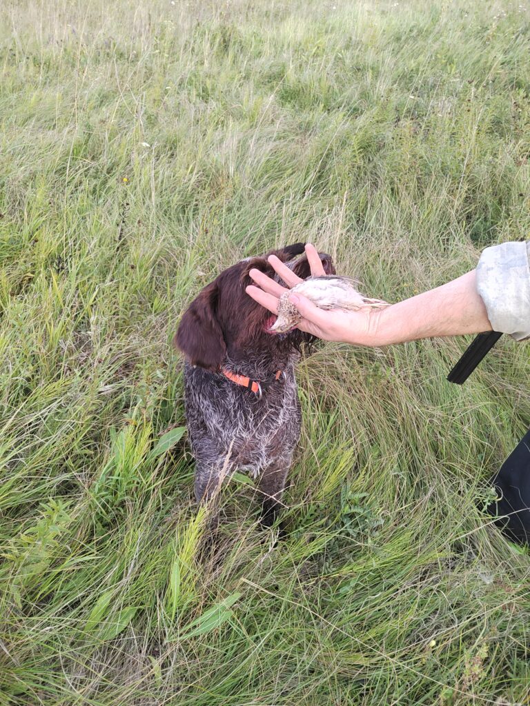 Когда вставали поговорить, Дэви делала стойку – замирала в характерной позе. Стас аккуратно подходил и кричал: «Давай, вперёд!» Собака двигалась, птица поднималась в воздух, и раздавалось два выстрела. Запах пороха витал повсюду. Дэви подносила птицу после команды «подай». Так добыли двух перепелок.
