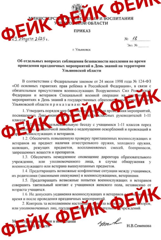 Ранее в интернете появилась информация, якобы Министерство просвещения и воспитания Ульяновской области издало приказ «Об отдельных вопросах соблюдения безопасности населения во время проведения праздничных мероприятий в День знаний на территории Ульяновской области» с целью утвердить порядок мер безопасности во время проведения мероприятий в День знаний.