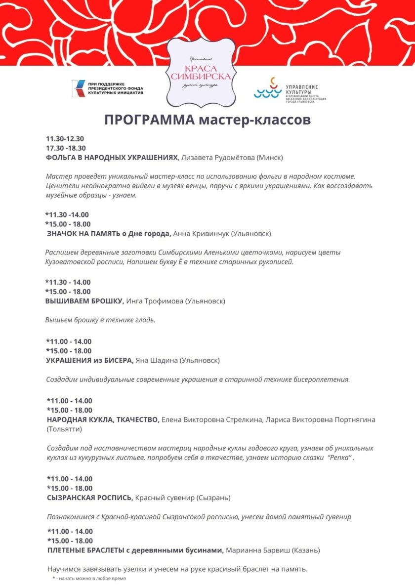 Традиционно Краса Симбирска не просто развлекательное мероприятие – особое внимание уделено лекционному блоку: с 14.00 до 16.00 гостей ждут встречи с учёными, коллекционерами и хранителями традиций, которые привезут уникальные материалы из своих архивов и коллекций.