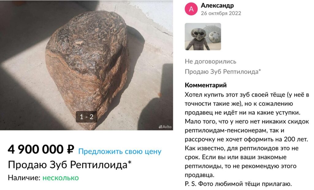 У инопланетян себестоимость чуть скромнее. Некий молодой человек представил в объявлении камень, самый обычный с виду. Но продавец уверяет, что это целый зуб инопланетянина. Цена – почти 5 миллионов рублей. Откуда и каким образом «зуб» добывался, парень умолчал. Однако под объявлением уже есть один «негативный» отзыв, описывающий всю сатиру продажи этого товара.