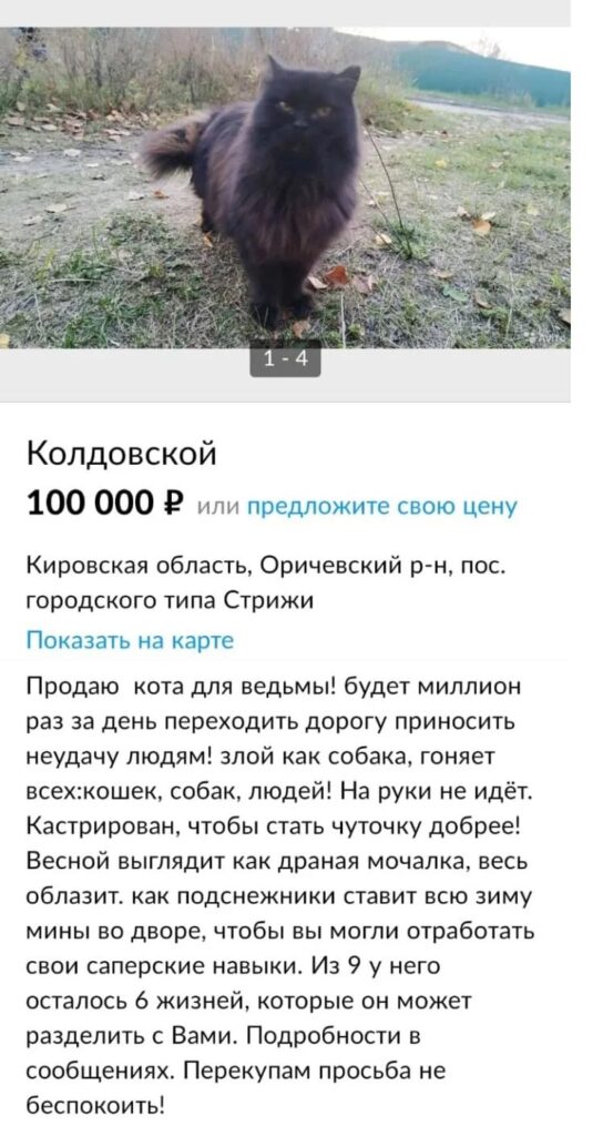 В Оренбургской области в добрые руки (желательно колдовские) продают чёрного пушистого кота. Свою грозную внешность, по словам продавца, котик полностью оправдывает действиями: оставляет «мины» зимой по всему двору, гоняет всех, в том числе и людей, хам и хулиган – под стать питомцу для ведьмы!