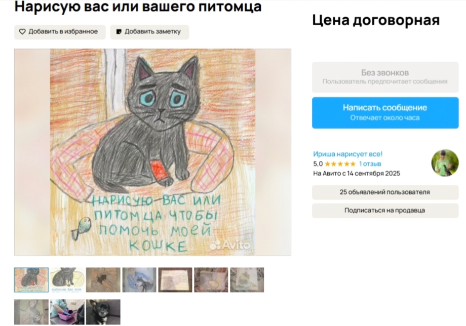 Например, 10-летняя девочка из Ульяновска по имени Ирина в своём объявлении именно такое и предложила: «Нарисую вас или вашего питомца, чтобы помочь моей кошке». К объявлению прикреплены дополнительные фото с творчеством девочки.