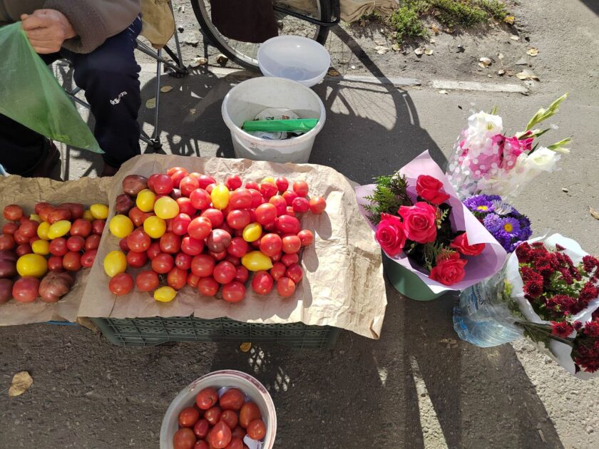 Для изучения вопроса мы отправились прямо к торговым точкам. Дни стоят ещё относительно тёплые, на улице Радищева в районе остановки «Гарнизонный магазин» около магазина сидят продавцы. Проходим мимо прилавков постельного белья и платков к бабушкам. В продаже сейчас помидоры, виноград, лук, картошка, осенние ягоды и цветы. Цены ниже магазинных.
