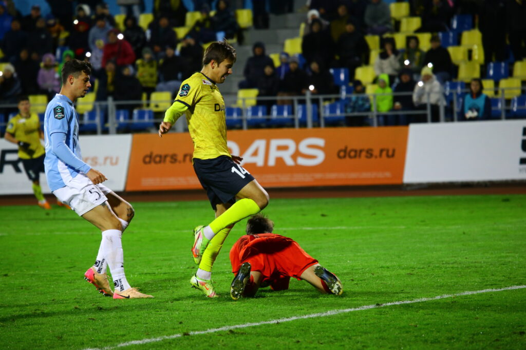 До перерыва кто-то из тренерского штаба гостей получил жёлтую карточку за споры с арбитром, а ульяновцы забили после розыгрыша углового. Но из офсайда. А вот Артём Максименко в противоположные ворота бил без нарушения правил — 0:2.