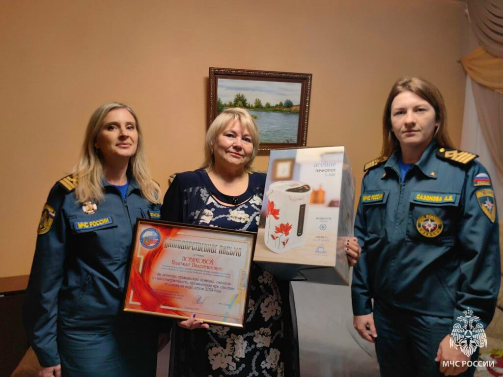 За активную гражданскую позицию, смелость и самоотверженность, проявленные при спасении человека на воде, жительница Ульяновска Надежда Новикова была удостоена Почетной грамоты начальника Главного управления МЧС России по Ульяновской области Михаила Осокина.