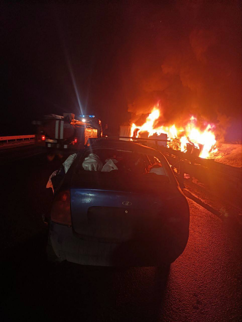 Водитель фуры, пытавшийся избежать ДТП, выкрутил руль и вылетел в кювет. Многотонная машина перевернулась, где пробила бензобак и впоследствии загорелась. Дальнобойщик смог выбраться из автомобиля, где ему помогли очевидцы, которые и вызвали скорую помощь и пожарных, которые вскоре смогли потушить грузовик.