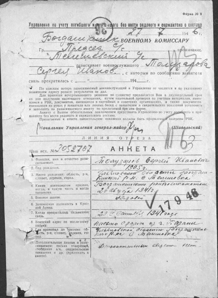 В августе 1941 года Толузаров С.И. ушел на фронт, а всего через месяц семья бойца получила последнее письмо от него. С тех пор на протяжении 84 лет его имя значилось в списках пропавших без вести.