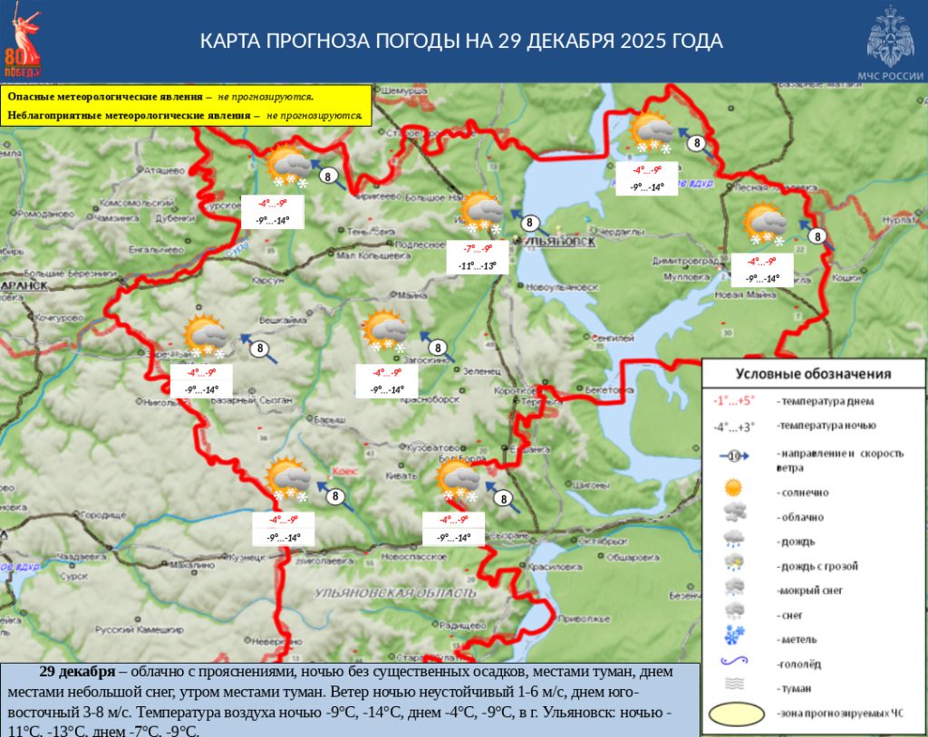 29 декабря в Ульяновской области облачно с прояснениями, ночью без существенных осадков, местами туман, днем местами небольшой снег, утром местами туман. Ветер ночью неустойчивый 1-6 м/с, днем юго-восточный 3-8 м/с. Температура воздуха ночью -9°С, -14°С, днем -4°С, -9°С, в г. Ульяновск: ночью -11°С, -13°С, днем -7°С, -9°С.