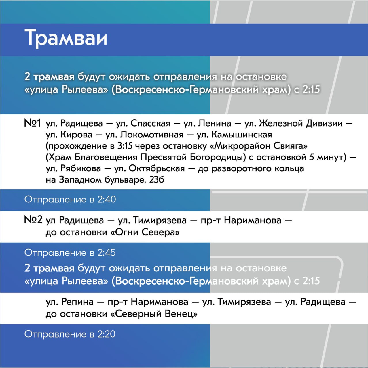 От Воскресенско-Германовского храма (ост. «Ул. Рылеева»): в 02:45 транспорт отправится в сторону «УКСМ» и «Огней Севера».