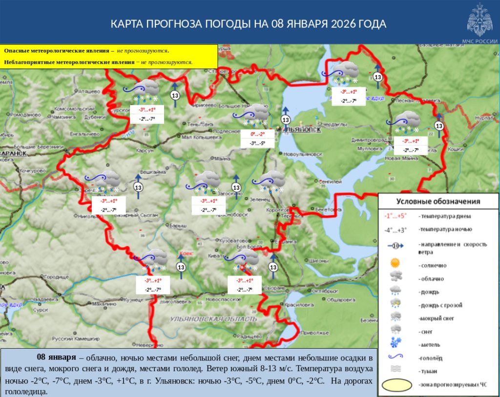 Завтра, 8 января, ожидается, что погода будет облачной, ночью местами небольшой снег, днем местами небольшие осадки в виде снега, мокрого снега и дождя, местами гололед. Ветер южный 8-13 м/с. Температура воздуха ночью -2°С, -7°С, днем -3°С, +1°С, в г. Ульяновск: ночью -3°С, -5°С, днем 0°С, -2°С. На дорогах гололедица.