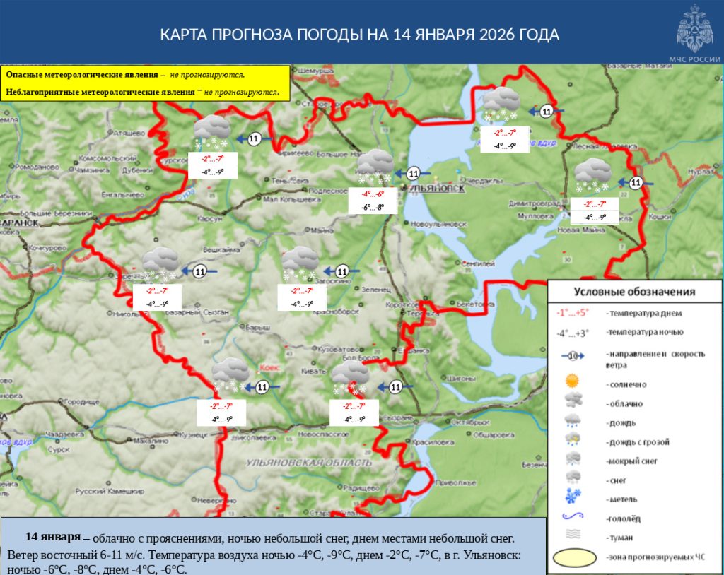 14 января в Ульяновской области облачно с прояснениями, ночью небольшой снег, днем местами небольшой снег. Ветер восточный 6-11 м/с. Температура воздуха ночью -4°С, -9°С, днем -2°С, -7°С, в г. Ульяновск: ночью -6°С, -8°С, днем -4°С, -6°С.