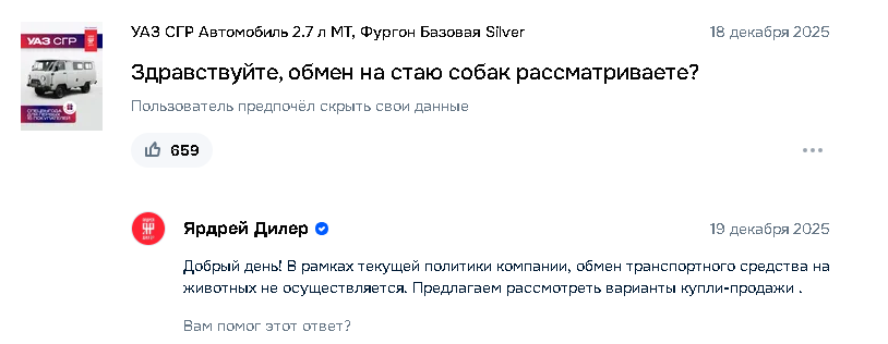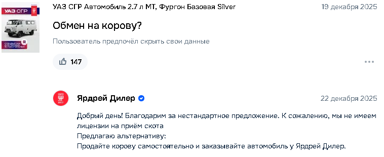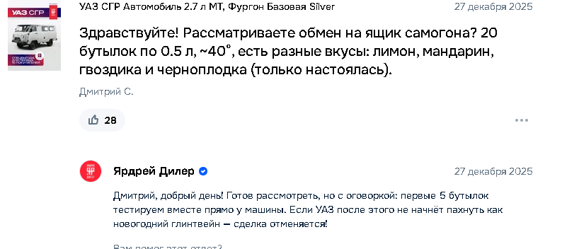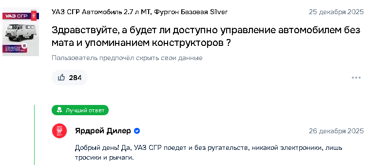 Впрочем, пока еще мало кто решился на покупку УАЗа через интернет. Вместо этого люди с определенной долей иронии начали интересоваться у продавца, входит ли ржавчина в комплекте, возможен ли обмен автомобиля на стаю собак и есть возможность управлять автомобилем без мата.