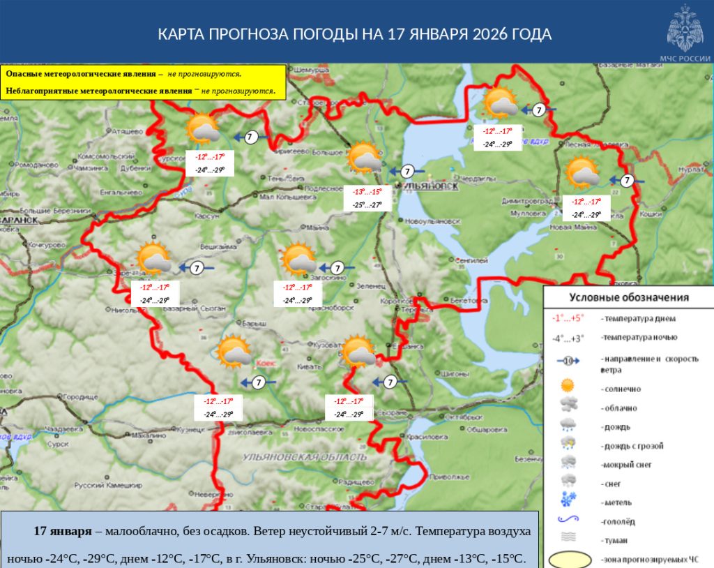 17 января в Ульяновской области малооблачно, без осадков. Ветер неустойчивый 2-7 м/с. Температура воздуха ночью -24°С, -29°С, днем -12°С, -17°С, в г. Ульяновск: ночью -25°С, -27°С, днем -13°С, -15°С.