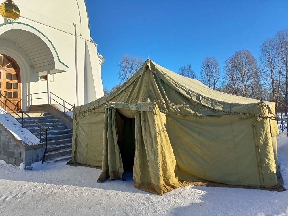 На территории храма силами МЧС организована палатка для переодевания и дежурство медицинских работников.